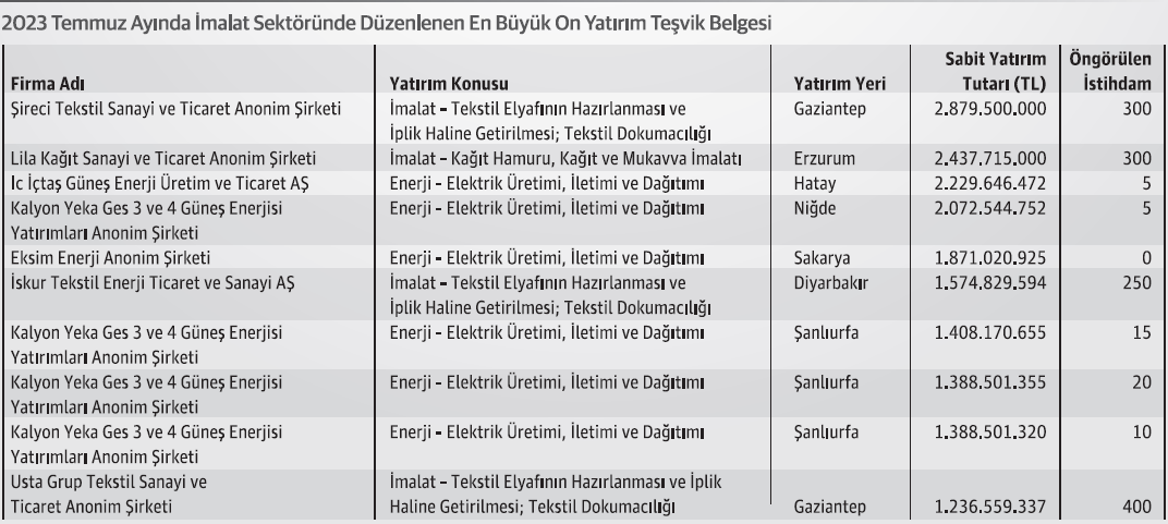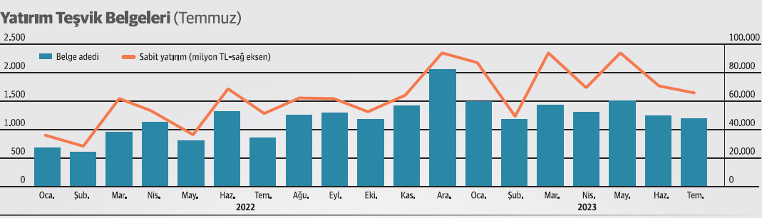 2023 Ocak-Temmuz döneminde öngörülen sabit yatırım tutarı toplam 532,5 milyar TL olan 9 bin 345 adet Yatırım Teşvik Belgesi düzenlenmiştir. Düzenlenen bu belgelerde toplam 200.438 kişilik istihdam öngörülmüştür.