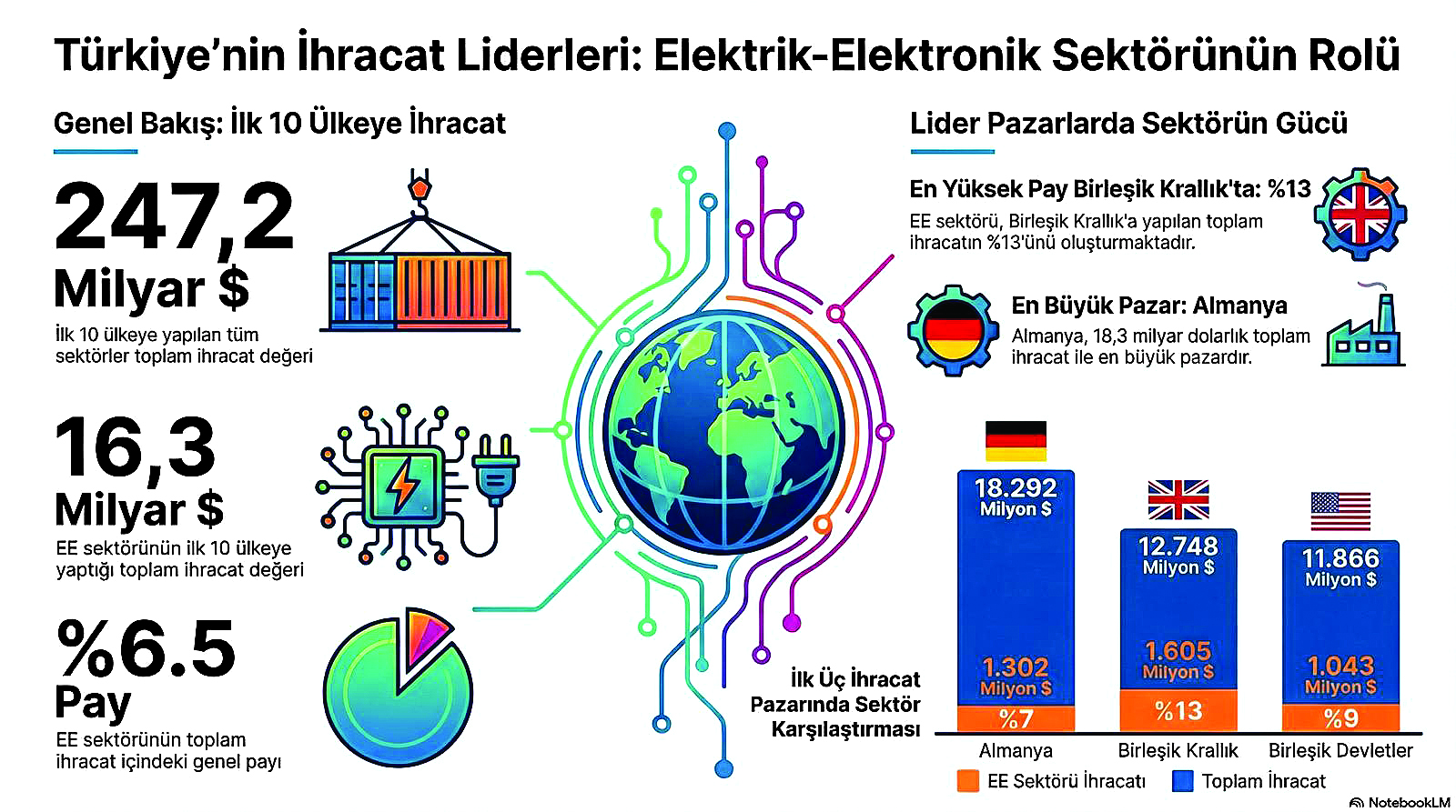 İhracatta en büyük payı yüzde 44 ile Avrupa Birliği ülkeleri alırken, diğer Avrupa ülkeleri yüzde 22 payla ikinci sırada yer aldı. Ülke bazında bakıldığında Birleşik Krallık 1,6 milyar dolar ile ilk sırada bulunurken, Almanya 1,3 milyar dolar ve ABD 1,0 milyar dolar ile onu izledi. Söz konusu dönemde ABD, 320 milyon dolarlık artışla ihracatını en fazla artıran ülke olurken; Rusya, 177 milyon dolarlık düşüşle en yüksek gerilemeyi yaşayan pazar oldu. Elektrik ve elektronik sektörünün Türkiye’nin toplam ihracatı içindeki payı ise yüzde 6,5 olarak gerçekleşti. Sektörün 2025 yılı sonunda toplam ihracatını 20 milyar dolar seviyesine taşıması bekleniyor. Bu hedef doğrultusunda; ana pazarlar olan Avrupa başta olmak üzere küresel talep istikrarı, dijital dönüşüm, otomasyon ve yapay zekâ entegrasyonu, yeşil dönüşüm yatırımları, uygun maliyetli finansmana erişim ve nitelikli iş gücü kritik başlıklar olarak öne çıkıyor.