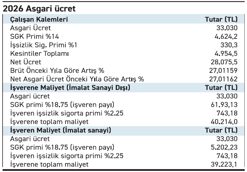 Asgari Ücret Tespit Komisyonu çalışmalarını tamamladı ve 2026’da asgari ücret, bir önceki yıla göre yüzde 27.01 artarak 28 bin 75 TL oldu. İşverene maliyet, imalat sanayii dışı şirketler için 40 bin 214 TL, imalat sanayii için 39 bin 223 TL olarak uygulanacak.