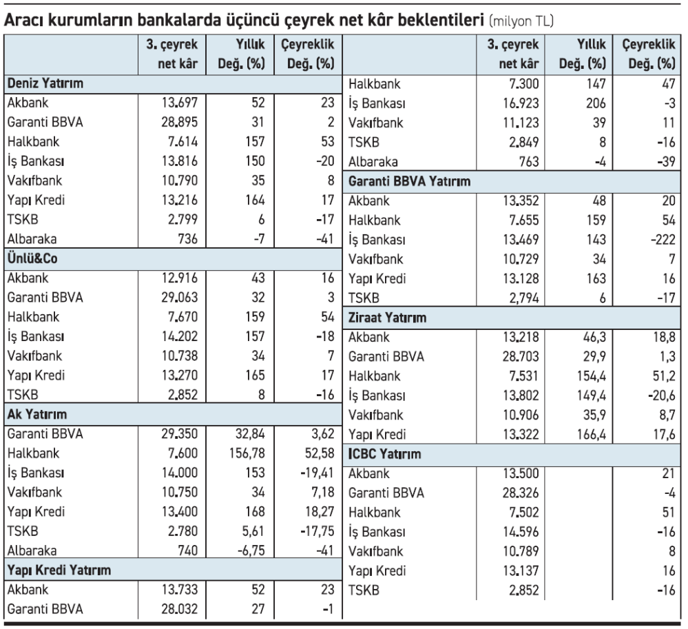 Kurum araştırma kapsamındaki bankalar için toplam net kârın üçüncü çeyrekte çeyreklik bazda neredeyse yatay kalmasını öngördü. Raporda temmuz ayında faiz indirimlerinin yeniden başlamasıyla şirketler açısından pozitif başlayan üçüncü çeyrekte bankaların performansının genel olarak yılsonu öz kaynak kârlılığı hedeflerinin gerisinde kaldığı vurgulandı. Rapora göre devam eden makro ihtiyati tedbirler ve faiz indirim hızındaki yavaşlama, net faiz marjı genişlemesini sınırladı. Ayrıca, tahsili gecikmiş alacaklardaki hızlanma, risk maliyetleri üzerinde baskı yarattı. Her ne kadar ücret ve komisyon gelirlerindeki olumlu trend sürse de birçok bankada enflasyonun üzerinde artan operasyonel giderler bu olumlu etkiyi büyük ölçüde törpüledi.