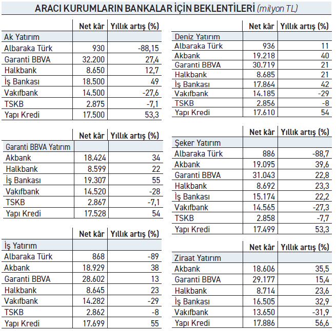 Kurum takip ettiği bankalar için ilk çeyrekte çeyreksel bazda yüzde 7 daralma, yıllık bazda ise yüzde 9 oranında kar artışı öngördü. Bu çeyrekte “baz etkileri ve operasyonel dinamiklerle ayrışan karlılık görünümü, faaliyet giderlerinde dönemsel artış ve komisyon gelirlerinde yatay-negatif seyir” öne çıktı. Analize göre kurum takip ettiği bankalar arasında, çeyreksel bazda en güçlü net kar artışını Yapı Kredi’de beklerken, sektör genelinde karlılık görünümünde belirgin bir ayrışmanın öne çıktığı bir çeyrek olacağını düşünüyor.