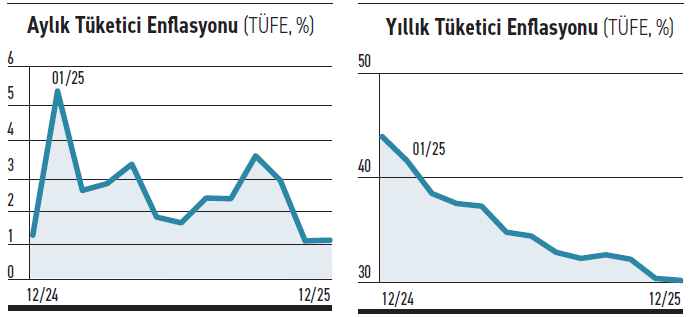 Türkiye’de tüketici enflasyonu 2025 yılını yüzde 30,89 ile geride bırakırken yılın son ayında enflasyon yüzde 0,89 ile yüzde 0,94 seviyesindeki beklentilerin altında geldi. Özellikle giyimi ve ayakkabı ile ulaştırma grubunda negatif enflasyon beklentilerin altında bir veriye neden olurken yıllık enflasyona en yüksek katkılar gıda ile konut grubundan kaynaklandı. Yıllık enflasyon 2024 sonundaki yüzde 44,38’den 13.49 puan azalırken yeni yılda Türkiye İstatistik Kurumu’nun enflasyon hesabında yapacağı güncellemelerle birlikte enflasyonda düşüşün daha belirginleşmesi ve Merkez Bankası’nın Para Politikası Kurulu toplantılarında faiz indirim sürecinin devam etmesi bekleniyor. 22 Ocak’ta yapılacak yılın ilk PPK toplantısında ise politika faizinin 150 baz puanlık indirimle yüzde 38’den yüzde 36,5’e çekilmesi tahmin ediliyor.