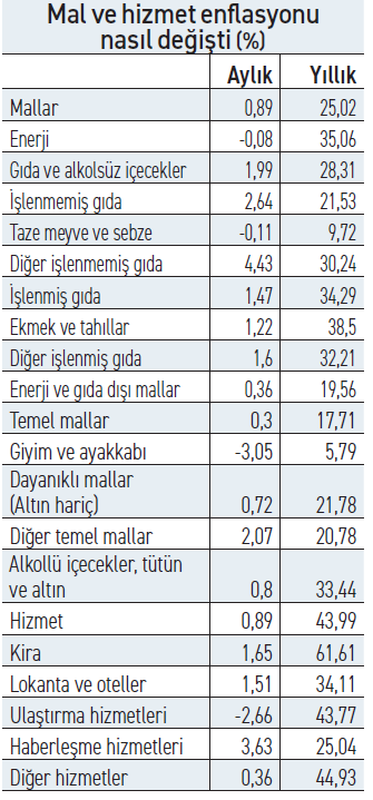 Eğlence ve kültürdü yüzde 0,75, eğitimde yüzde 0,13 artışlar olurken eğitim yıllık yüzde 66,27 enflasyonuyla gruplar arasında en yüksek yıllık enflasyona ulaştı ama manşet enflasyona katkısı payındaki düşük seviye nedeniyle 1.53 puanda kaldı. Lokanta ve otellerde aylık yüzde 1,51, çeşitli mal ve hizmetlerde ise aylık yüzde 1,34 enflasyon gerçekleşti.