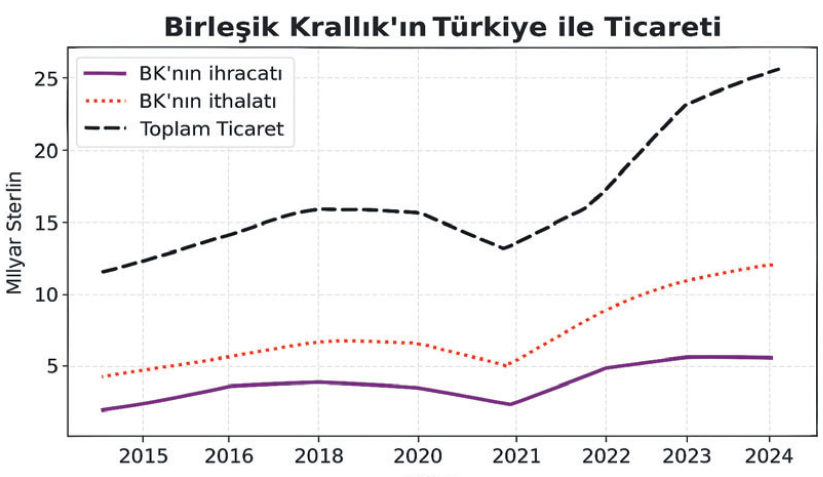 Rapora göre Türkiye, Birleşik Krallık’ın ihracatında 23’üncü, ithalatında ise 14’üncü sırada yer alıyor. İki ülke arasındaki toplam ticaret hacmi 2025’in ikinci çeyrek sonuna kadar olan dört çeyreklik dönemde 27,9 milyar sterline ulaştı. Bu, bir yıl önceki yıla göre yüzde 4,4’lük artış anlamına geliyor. Böylece Türkiye, İngiltere’nin toplam ticaretinde yüzde 1,5 payla 17’nci sırada yer aldı. İki ülke toplam ticareti 2014 yılında 14,4 milyar sterlin seviyesindeydi.