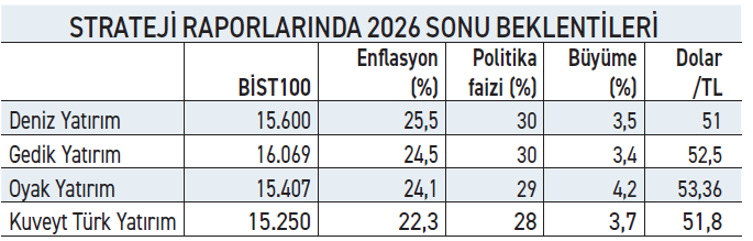 Kuveyt Türk Yatırım’ın strateji raporunda ise BİST100 için 12 aylık hedef fi yatı 15 bin 250 olarak belirlerken, söz konusu seviye 33 ’lük getiri potansiyeline işaret etti. 2026 yılında küresel tarafta birçok değişkenin gündemde olabileceği kaydedilen raporda yurt içi tarafta ise makroekonomik gelişmeler ve yurt içi haber akışlarının fiyatlamalar üzerinde belirleyici olması bekleniyor. Yurtiçinde gözlerin TCMB faiz kararlarında olacağı bir yılın beklendiğine işaret edilen rapora göre faiz indirim döngüsünün devam etmesi yüksek faiz ortamında getiri elde eden yerli ve yabancı yatırımcıların riskli varlıklara yönelmesini hızlandırabilir. Kuveyt Türk Yatırım uzmanları bankacılık, çimento, gıda perakende, gayrimenkul YO, sanayi, sağlık ve ulaştırma sektörlerinin öne çıkmasını beklerken endeks bazlı hareketlerden ziyade sektör ve şirket bazlı ayrışmanın ön plana çıkacağı bir yıl tahmin etti.