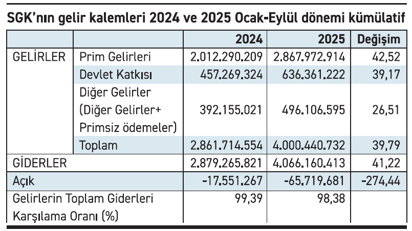 SGK’nın gelirleri içinde bazı kalemler Hazine tarafından doğrudan finanse ediliyor. SGK’ya gelir olarak yansıyan Hazine aktarımlarına bakıldığında, her bir çalışan için devletin SGK’ya karşılıksız aktardığı kalem olan devlet katkısı yüzde 39,7 artarken, aralarında işveren prim hissesi de ve başta yatırım teşvikleri olmak üzere, teşvik ve istisnalar dahil, prim karşılığı olmayan ödemeler için verilenlerin bulunduğu tutar yüzde 26,51 arttı. Toplam gelir artışı yüzde 39.8 oldu. 2024’te gelirlerin giderleri karşılama oranı yüzde 99,7 seviyesindeyken, bu yıl Ocak-Eylül döneminde bu oran yüzde 98,4’ geriledi.