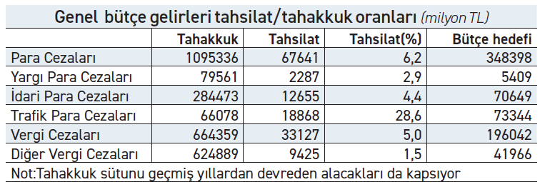 Hazine ve Maliye Bakanlığı Mart ayı sonu itibarıyla 3 aylık bütçe açığını 420 milyar lira olarak duyurdu. Bütçe gelirlerinin önemli bölümünü vergi gelirleri oluşturmakla birlikte, para cezaları kalemi de azımsanmayacak önemde yer tutuyor. Ancak yüksek miktarlı kesilen cezalara rağmen, tahsilat oranı çok düşük düzeyde seyrediyor. Bütçenin vergi cezaları kaleminde Mart sonu itibarıyla 1 trilyon 95 milyar liralık tahakkuka karşılık, tahsilat sadece 67 milyar lirada kaldı. Bunun oransal karşılığı ise yüzde 6.2 olarak duyuruldu.