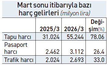 Hazine ve Maliye Bakanlığı’nın konut satışlarını sıkı takibe almasıyla birlikte, evlerin gerçek değerlerine daha yakın gösterilmesi, kamunun tapu harcı gelirlerini de önemli ölçüde artırdı. 2026 yılı ilk çeyreğinde tapu harcından elde edilen gelir geçen yılın aynı dönemine göre yüzde 78 gibi yüksek oranlı artış göstererek 31 milyar liradan 55 milyar liraya çıktı. Üstelik bu artış, ilk çeyrek sonunda konut satışı 115 binden 113 bine gerilemiş olmasına rağmen yaşandı. Aynı dönemde pasaport harcı yüzde 26.4 artarak 3 milyar 112 milyon liraya, trafik harcı yüzde 33 artarak 2 milyar 693 milyon liraya çıktı.