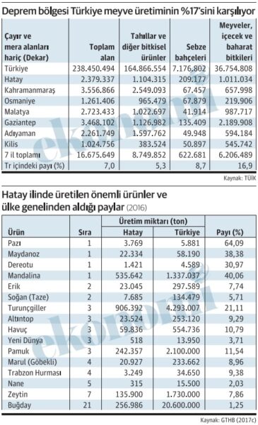 Deprem illeri Türkiye meyve üretiminin yüzde 17’sini gerçekleştiriyor. Malatya kayısı üretiminin, Gaziantep adıyla anılan Antep fıstığının başkenti, üretim merkezi. Hatay Türkiye’de en fazla mandalina üretimi yapılan il, erikte ise Türkiye’nin ikinci büyük üreticisi. Kahramanmaraş, cevizde en önde gelen iller arasında. Türkiye tütün üretiminde Adıyaman ilk sırada. Önlem alınmaz, tarım üretimi bir an önce ayağa kaldırılmazsa, sezonda, özellikle bazı meyve türlerinde rekolte ciddi ölçüde düşecek, fiyatlar yükselecek, gıda sanayi tedarik sıkıntısı çekecek. Deprem nedeniyle büyük zarar gören illerde tarım daha çok küçük aile işletmelerinde, köylerde yapıldığı için, deprem etkisi sanayi ile kıyaslanamayacak ölçüde derin. Durum, hayvancılık alanında da farklı değil. Ancak hayvancılık tarafının gördüğü zarara birçok kez dikkat çekilmesine karşın tarla, bağ, bahçe tarımı yönünden ortaya çıkan riskler de ciddi boyutta.