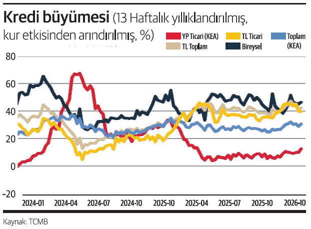 Merkez Bankası Başkanı Fatih Karahan da geçen hafta gerçekleştirdiği yılın ilk Enflasyon Raporu toplantısında yabancı para kredi büyümesinin büyüme kısıtlarının ima ettiği oranların sınırlı bir miktar üzerinde seyrettiğini kur etkisinden arındırılarak hesaplanan 13 haftalık yıllıklandırılmış yabancı para ticari kredi büyümesinin ise 30 Ocak itibarıyla yüzde 13 seviyesinde olduğunu açıkladı. Aynı dönemde TL cinsi ticari kredi büyümesi ise yüzde 41,9 seviyesinde oldu. Başkan Karahan yabancı para cinsi kredilere büyüme sınırını düşürdüklerini de hatırlattı.