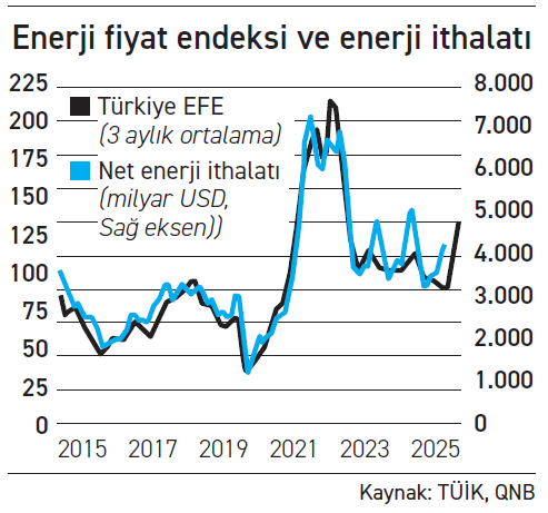 QNB ekonomistleri Erkin Işık, Deniz Çiçek ve Şakir Oktay Gür’ün hazırladığı analizde dış denge görünümü ele alındığında Türkiye’de değerlendirmelerin genellikle ham petrol fiyatları üzerinden yapılsa da doğalgaz fiyatlarının da dış açığa belirgin etkisi bulunduğu vurgulandı. Analize göre bu nedenle, ham petrol fiyatlarının yüzde 20’ye yakın artışının yanı sıra doğalgaz fiyatlarının son hafta içinde neredeyse iki katına çıkması da belirgin olarak etkide bulunacak. Bu çerçevede petrol ve doğal gaz fiyatları ile ithalat miktarlarını kullanarak Türkiye için ithalat ağırlıklarını hesapladıkları ve bir Enerji Fiyat Endeksi (EFE) geliştirdiklerini kaydeden QNB ekonomistleri analizinde, hesaplamalarına göre mevcut fiyat seviyeleri korunursa EFE önümüzdeki dönemde yüzde 50 civarında yükselecek.