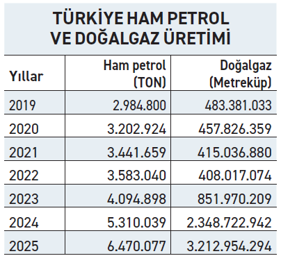Maden ve Petrol İşleri Genel Müdürlüğü (MAPEG) ve Enerji Piyasaları Düzenleme Kurumu (EPDK) verilerine göre Türkiye’nin birincil enerji kaynaklarında 2025 sonunda üretim olarak; 6 milyon 470 bin ton ham petrol yerli üretimi, 31 milyon 938 bin ton ham petrol ithalatı; 3 milyar 212 milyon 954 bin metreküp doğal gaz yerli üretimi, 57 milyar 837 milyon metreküp doğalgaz ithalatı görüldü.