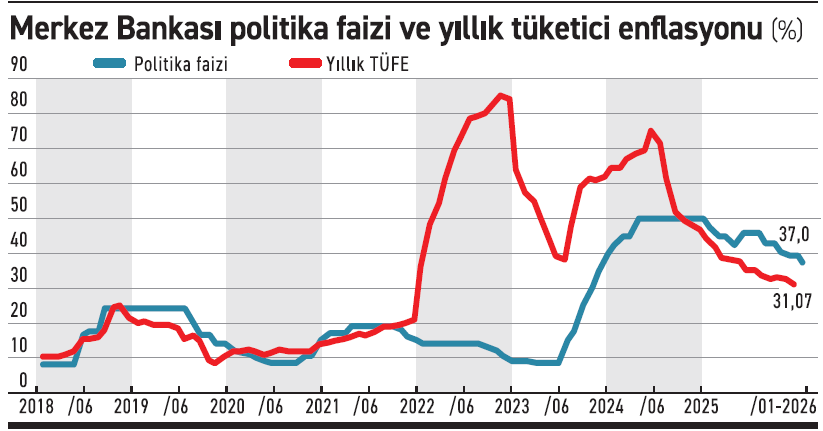 Merkez Bankası 2026 yılına temkinli başladı. Yılın ilk Para Politikası Kurulu toplantısında 150 baz puanlık indirim beklentisine karşılık 100 baz puanlık indirimle Merkez Bankası politika faizini yüzde 38’den yüzde 37’ye çekti. Uzmanlar, yüksek gelmesi beklenen ocak ayı enflasyonunun Merkez Bankası’nın ihtiyatlı davrandırdığını belirtirken borsanın tepkisi sert oldu. Borsa İstanbul’da bankacılık endeksinde karar sonrası düşüş yüzde 3’e yaklaştı.