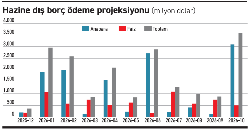 Hazine ve Maliye Bakanlığı ekim ayı sonunda yayımladığı 2026 finansman raporunda 2026 yılında uluslararası sermaye piyasalarından tahvil ve kira sertifikası ihraçları yoluyla 13 milyar dolar karşılığında finansman sağlanmasının öngörüldüğünü açıkladı. Rapora göre 2026 yılında, 3 trilyon 289,7 milyar TL anapara ve 2 trilyon 700,3 milyar TL faiz olmak üzere toplam 5 trilyon 990,0 milyar TL tutarında borç servisi gerçekleştirilmesi bekleniyor. Borç servisinin 5 trilyon 42,2 milyar TL’sinin iç borç; 947.8 milyar TL’sinin ise dış borç servisi olarak yapılması bekleniyor. Dış borç ödemelerinin 25.5 milyar dolar seviyesinde olması tahmin ediliyor.