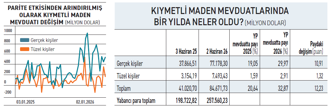 Hem gerçek hem de tüzel kişilerin kıymetli maden mevduatının toplam yabancı para mevduatı içindeki payı da artışa paralel yükseliş sergiledi. Merkez Bankası verilerine göre son bir yılda gerçek ve tüzel kişilerin kıymetli maden mevduatı parite etkisi dahil yüzde 106,4 arttı ve 41 milyar 20,7 milyon dolardan 84 milyar 671,7 milyon dolara yükseldi. Toplam yabancı para mevduatı içinde kıymetli maden mevduatının payı da geçen yılki yüzde 20,64 seviyesinden 12.23 puan artışla yüzde 32,87'ye kadar yükseldi. Son bir yılda kıymetli maden mevduatları iki katından fazla artarken yabancı para mevduatında artış yüzde 29,6'da kaldı. Parite etkisinden arındırılmış olarak da son bir yılda toplam kıymetli maden mevduatı 15 milyar 265,7 milyon dolar yükseldi.