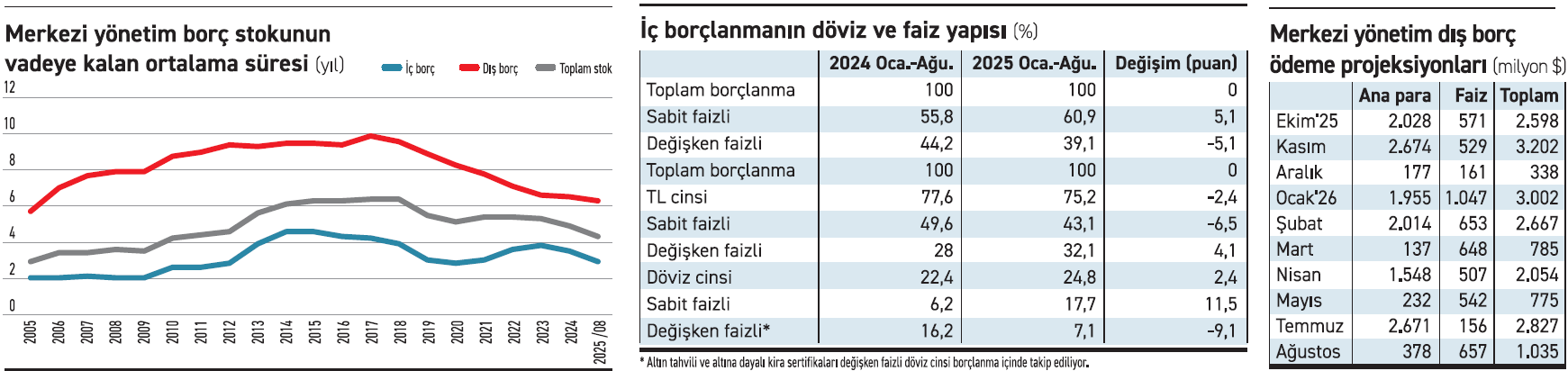 TL cinsi borcun iç borç stokundaki payı yüzde 77,6’dan 2.4 puan gerileyerek yüzde 75,2’ye indi bu yıl ilk 8 ayda. TL cinsi sabit faizli borcun iç borç stokundaki payı 2024 ocak-ağustosta yüzde 49,6 iken son bir yılda bu oran 6.5 puan geriledi ve yüzde 43,1’e indi. TL cinsi değişken faizli borcun iç borç stokundaki oranı yüzde 32,1’e çıktı bu yıl ilk 8 ayda 4.1 puan yükseldi. Döviz cinsi borcun iç borcun stokundaki payı da 2.4 puan arttı ve yüzde 22,4’ten yüzde 24,8’e çıktı. Sabit faizli döviz cinsi borcun iç borç stokundaki payı 11.5 puan artışla yüzde 6,2’den yüzde 17,7’ye çıkarken, değişken faizli kısım ise yüzde 16,2’den yüzde 7,1’e geriledi. Döviz cinsi borcun payı artarken TL ve TL cinsi sabit faizli borcun iç borçlanmadaki payı geriledi. Bu da hem kur hem faiz dalgalanmalarına daha hassas bir yapıya döndürdü iç borç stokunun. Vade yapısının kısalması da bu değişimin daha riskli hale gelmesine yol açıyor uzmanların görüşüne göre.