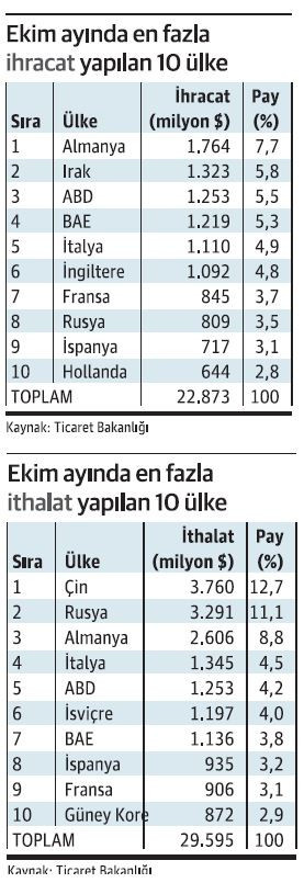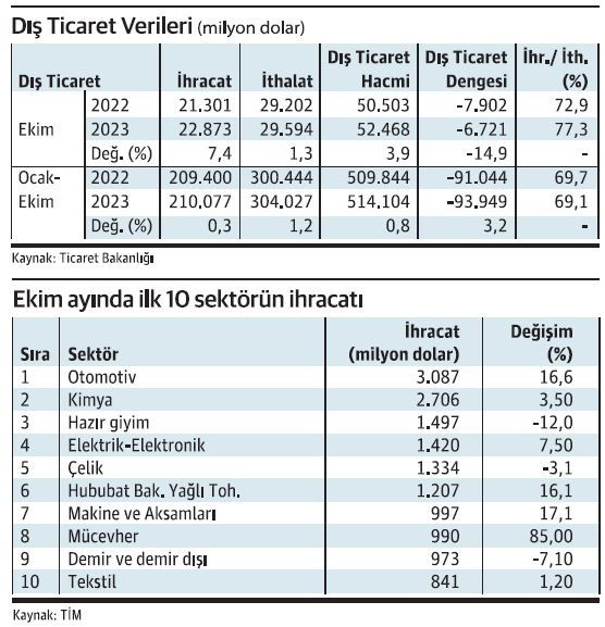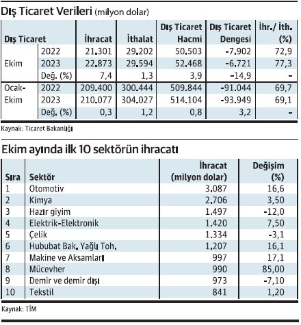 Ticaret Bakanlığı ve Türkiye İhracatçılar Meclisi (TİM), Türkiye’nin ekim ayına ilişkin dış ticaret verilerini Ankara’da açıkladı. Ekim ayında ihracat geçen yılın aynı ayına göre yüzde 7,4 artışla 22 milyar 873 milyon dolar oldu. İhracat, yılın 10 aylık döneminde ise yüzde 0,3 artışla 210 milyar 77 milyon dolara ulaştı. Ekim ayında ithalat yüzde 1,3 oranında artışla 29 milyar 594 milyon dolar olurken, yılın 10 aylık döneminde yüzde 1,2 oranında artışla 304 milyar 27 milyon doları buldu.
