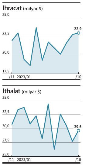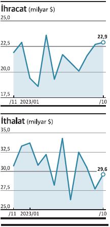 Türkiye’nin ekim ayı ihracatı yüzde 7,4 artışla 22,9 milyar dolar olurken, ağustos ayından itibaren gerileyen ithalat ise kısmi bir yükselişle yüzde 1,3 artarak 29,6 milyar dolar oldu. İhracatın ithalatı karşılama oranı da ekimde yüzde 77,3’e yükselirken, dış ticaret açığı 6,7 milyar dolara çıktı. Yılın 9 aylık döneminde ise dış açık 94 milyar dolara ulaştı.