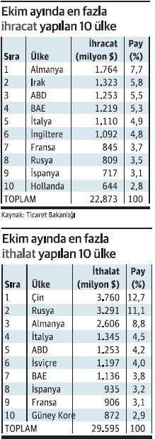 Dış ticaret hacmi ekimde yüzde 3,9 düşüşle 52,5 milyar dolar olurken, Ocak-Ekim döneminde yüzde 0,8 yükselişle 514,1 milyar dolara çıktı. Dış ticaret dengesine bakıldığında, ekim ayında 6,7 milyar dolarlık açık verilirken, 10 aylık dönemdeki açık 94 milyar dolar oldu. İhracatın ithalatı karşılama oranı ekimde yüzde 77,3’e yükselirken, Ocak- Ekim döneminde bu oran yüzde 69,1’e geriledi.
