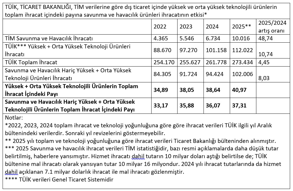 Savunma ve havacılık sanayii, enerji ve madenciliğin dışarıda bırakıldığı, ülkenin mal üretim yeteneğini gösteren imalat sanayii sektörü olarak sınıflanıyor. İmalat sanayii içindeki pay ve ihracata etkisine bakıldığında, katkı daha da belirgin hale geliyor. Savunma ve havacılık hariç, imalat sanayii içindeki yüksek ve orta yüksek teknolojili ürünlerin payı neredeyse sabit seyrediyor. 2023’te yüzde 38,07 olan pay, 2024’te yüzde 39,58’e yükseldi. Ancak savunma ve havacılık dahil edilerek imalat sanayii ihracatı içindeki yüksek ve orta yüksek teknolojili ürünlere bakıldığında paylar aynı yıllar sırasıyla; yüzde 40,38; yüzde 41,03 ve 2025’te yüzde 43,47’ye ulaşıyor.