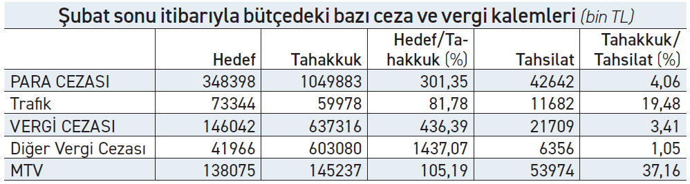Bütçede tahakkuk eden 1 trilyon liralık para cezasının yaklaşık yüzde 60.7’sine karşılık gelen 637 milyar 316 milyon liralık kısmı vergi cezalarından oluştu. Yılın tamamı için 146 milyar 42 milyon liralık gelir hedefinin bulunduğu vergi cezası kaleminde iki aylık dönemde hedefin yüzde 436.3’ü kadar tahakkuk gerçekleşti. Bu kalemin tamamına yakını ise denetim kaynaklı cezalardan oluştu. Diğer vergi cezaları; tespit edilen belge düzenine uymama, fiş kesmeme, sevk irsaliyesi kesmeme, gibi eylemlere yönelik verilen cezaları kapsıyor.
