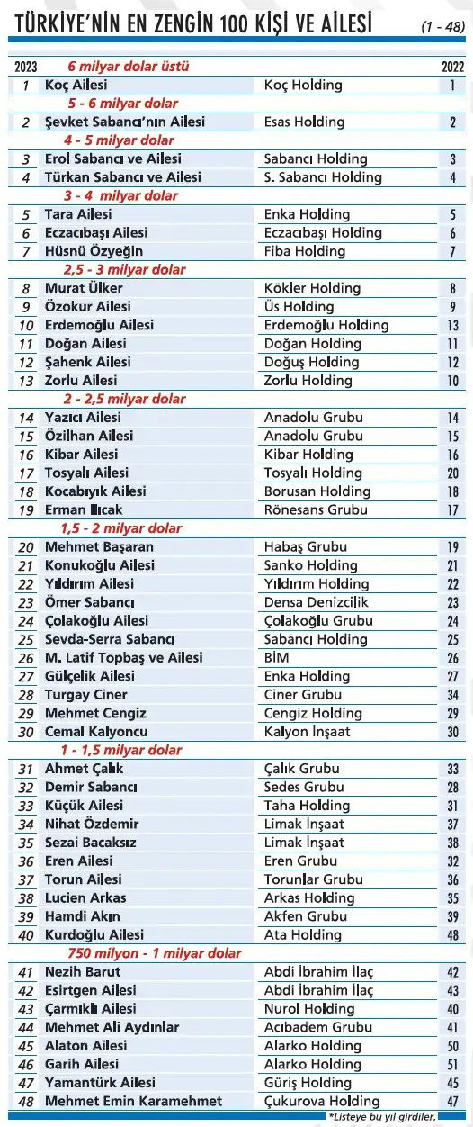 Ekonomist Dergisi'nin hazırladığı En Zengin 100 listesi açıklandı. Bu yıl 20'ncisi hazırlanan listede Türkiye'nin en zengin aileleri listelenirken, listenin ilk 10 sırasında bir aile değişti.