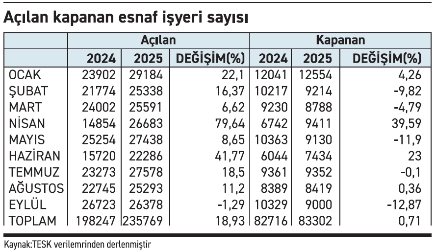 Ocak-eylül döneminde ise açılan esnaf iş yeri sayısı yüzde 18.9’luk artışla 235 bin 769’a çıkarken, kapanan iş yeri sayısı neredeyse yerinde saydı ve yüzde 0.71’lik artışla 83 bin 302’ye yükseldi. 2024 yılının tamamında kurulan esnaf işyeri sayısı önceki yıla göre yüzde 8.33 azalarak 287 bin 624’e, kapanan işyeri sayısı da yüzde 13.7 azalarak 120 bin 5’e gerilemişti.