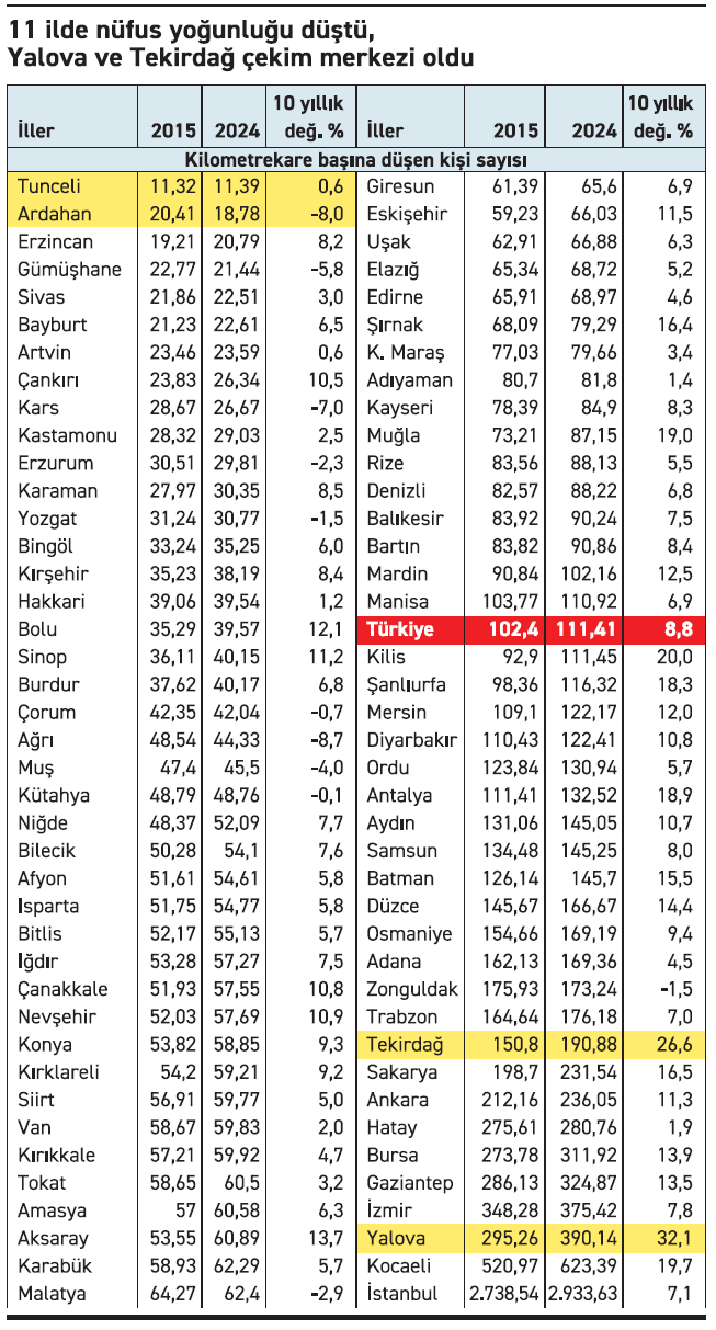 Kilometrekare başına düşen kişi sayısı bakımından 81 ilin tablosu dikkat çekici bir tablo veriyor. İstanbul’daki yoğunluk, “birine çarpamadan yürümek imkansız” dedirtiyor. Bazı iller de ise “insansızlık” denilebilecek düzeyler var. Ekonomik bakımdan atak yapan iki il (Yalova ve Tekirdağ) yoğunluk artışında ilk iki sırada.