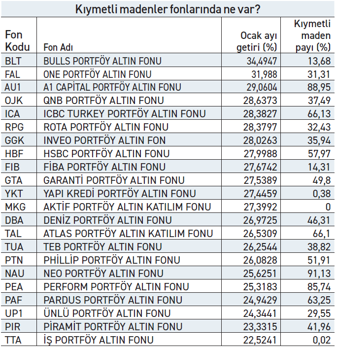 TEFAS verilerine göre kıymetli maden fonları ocak ayında ortalama yüzde 17,5 getiri sağladı. Ve bu tüm yatırım fonları arasında liderliği almasını sağladı. 24 kıymetli maden fonunda getiriler ise farklılaştı. TEFAS verilerine göre kıymetli maden fonları içinde en yüksek getiri aylık yüzde 34,5 olurken en düşük getiri ise yüzde 22,52 ile yine fiziki altının ocak ayı getirisinin üzerinde gerçekleşti. En yüksek aylık getiriyi sağlayan Bulls Portföy Altın Fonu’nda ise kıymetli maden payı yüzde 13,68 seviyesinde. Fonun portföyünün yüzde 8,04’ü hisse senedi, yüzde 25,76’sı yatırım fonları katılma payında, yüzde 39,84’ü borsa yatırım fonu katılma paylarında, yüzde 12,68’i vadeli işlemler nakit teminatlarında bulunuyor.