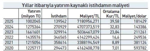 Teşvik sistemi 2025 yılı Mayıs ayında değiştirildi. Bu değişiklikten sonra Sanayi ve Teknoloji Bakanlığı teşvik istatistiklerini, verilerin önemli bölümünü eksilterek yayımlamaya başladı. Bakanlığın teşvik bülteninden yapılan hesaplamalara göre 1 kişiyi istihdam etmek için gerekli olan yatırım tutarı (toplam yatırımın istihdam sayısına bölünmesiyle hesaplandı) 2020 yılında döviz cinsinden 593 bin dolar seviyesindeydi. Bu tutar 2021’de 381 bin dolara, 2022’de 249 bin dolara, 2023’te ise 211 bin dolara geriledi. 2024 yılında 1 kişiyi istihdam etmek için gerekli olan yatırım 143 bin dolara inerken, geride bıraktığımız 2025 yılında yaklaşık 40 bin dolarlık artışla 181 bin dolara yükseldi. Buna karşılık teşvikli yatırımlarla oluşturulan istihdam yarıya yakın azalarak 270 bin 929’dan 139 bin 542’ye geriledi. Son 6 yıllık zaman diliminde en yüksek istihdam 358 bin 614 ile 2021 yılında yaratıldı.
