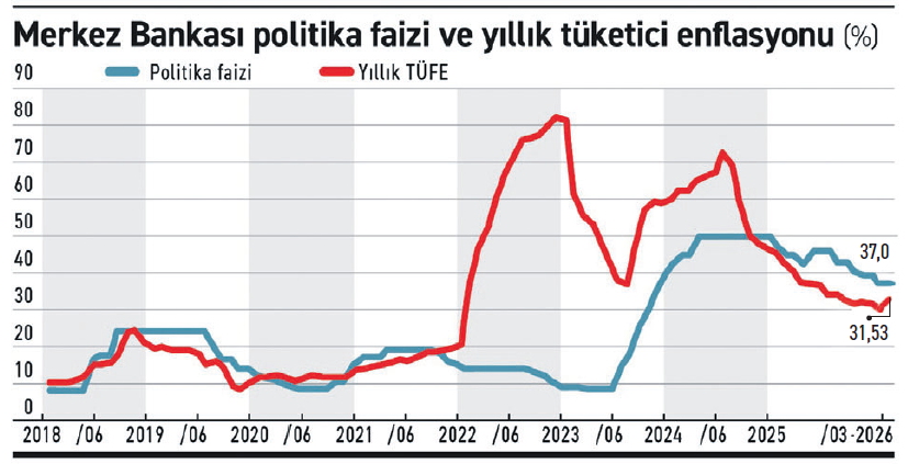 Türkiye Cumhuriyet Merkez Bankası Para Politikası Kurulu (PPK) yılın ikinci toplantısında beklentilere paralel yüzde 37 politika faizinde değişikliğe gitmedi. Ayrıca gecelik vadede borç verme faiz oranını yüzde 40’ta, gecelik vadede borçlanma faiz oranını da yüzde 35,5’te sabit tuttu. PPK toplantısı öncesinde ABD ve İsrail’in İran’a saldırılarının başlamasının hemen ardından yüzde 37 politika faizinden piyasayı fonladığı repo ihalelerine ara veren ve likidite yönetimine yönelik adımlar atan Merkez Bankası piyasa ve fonlama faizini 3 puan artışla yüzde 40’e çekmişti. Uzmanlar belirsizliğin çok yoğun olduğu bu dönemde Merkez Bankası’nın hamlelerinin etkisini görmek için PPK’da yeni bir adım atmadığını vurgularken ancak enflasyonda belirgin ve kalıcı bir bozulma olması durumunda faiz artışı hamlesinin gelebileceğine yönelik mesaj da verdiğini dile getirdi.