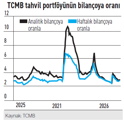 QNB ekonomistleri daha önceki araştırmalarında TCMB’nin menkul kıymet portföyünü (APİ portföyü), parasal genişlemeci olarak algılanmadan ne ölçüde artırabileceğini incelemişti. Rapora göre geçmişte TCMB’nin tahvil portföyünün bilançoya oranla seviyelerine bakıldığında, 2025 sonunda analitik bilançoya oranla yüzde 2,5’e, haftalık bilançoya göre ise yüzde 2,2’ye kadar gerileyen APİ portföyünün, tarihsel ortalamalara yakın şekilde yüzde 3 civarına yükselebileceği değerlendirildi.