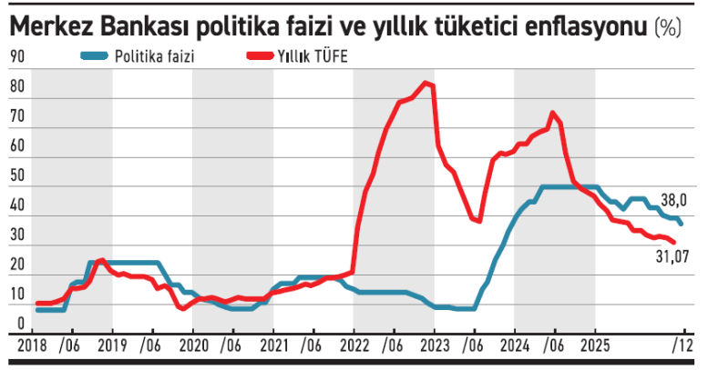 Merkez Bankası yılın son Para Piyasası Kurulu toplantısında piyasa beklentilerine paralel 150 baz puanlık indirimle politika faizini yüzde 39,5’ten yüzde 38’e indirdi. Kasım enflasyon verisindeki iyimserlikle piyasa 150 baz puanlık indirimi fiyatlamıştı ancak uzmanlar 2026 sonu Merkez Bankası’nın ara hedefi yüzde 16’nın tutturulabilmesi için 100 baz puan hatta pas geçilmesi gerektiğini dile getiriyordu. Piyasanın 2026 sonu için enflasyon beklentisi yüzde 20-25 seviyelerinde. Uzmanlar 150 baz puanlık indirimle Merkez Bankası’nın yüzde 16’yı gerçekleştirilebilecek bir hedef olarak içselleştirmediği ve bu ara hedefin şubattaki ilk enflasyon raporu toplantısında değiştirilebileceğini vurguladı. Ancak TÜİK’in değişen hesaplama yöntemi ve aralık ile ocakta olumlu gelmesi muhtemel enflasyon verileriyle politika faiz indirimlerinin hızlanabileceğine de işaret edildi.