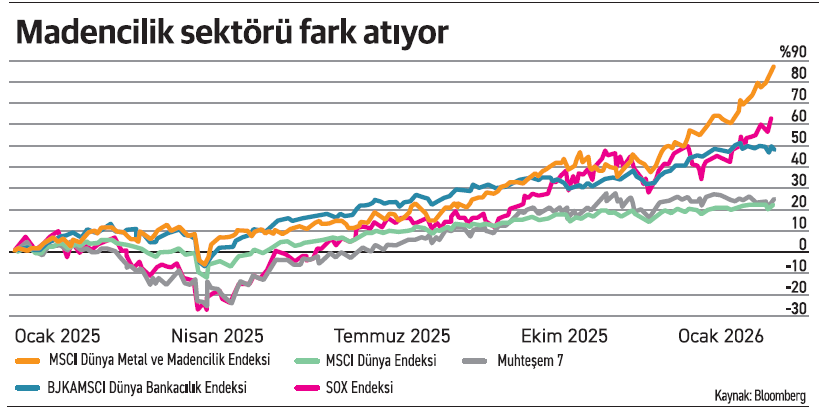 Bu görünüm rakamlara da net biçimde yansıyor. MSCI Metal ve Madencilik Endeksi, 2025 başından bu yana yaklaşık yüzde 90 değer kazanarak yarı iletkenler, küresel bankalar ve “teknoloji devlerini açık farkla geride bıraktı. Aynı dönemde bakır fiyatları yüzde 50 yükselirken, altın. gümüş, platin zirvede, alüminyum ve nikel de son yılların en yüksek seviyesinde seyrediyor. Özellikle altın rekor seviyelerini koruyarak madencilik şirketlerinin kârlılığını desteklemeye devam ediyor.