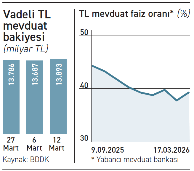 Bankacılık Düzenleme ve Denetleme Kurumu (BDDK) günlük verileri de vadeli TL mevduatta artış, döviz mevduatlarında ise yatay bir seyir olduğunu ortaya koyuyor. BDDK verilerine göre 6 Mart ile biten haftada 265 milyar 932 milyon dolar olan bankacılık sektöründe yabancı para mevduatı 12 Mart Perşembe günü itibariyle 266 milyar 336 milyon dolara sınırlı yükseldi. Savaşın ikinci haftasında yabancı para mevduatta parite etkisi dahil artış 404 milyon dolar oldu. 27 Şubat ile biten haftaya yani savaşın başlamasından bir gün öncesine göre ise yabancı para mevduatta yine parite etkisi dahil gerileme yaşandı. Bu düşüşte altın fiyatlarının kaybı etkili oldu. 27 Şubat ile biten haftada yabancı para mevduatı bakiyesi 268 milyar 764 milyon dolardı.