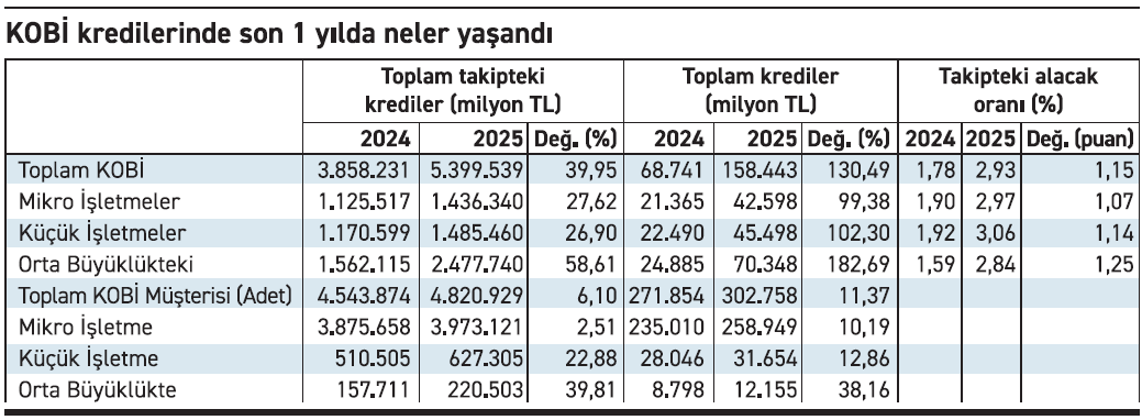 Toplam KOBİ kredilerinde takipteki alacak miktarı artışı yüzde 130,5 olurken bu TL cinsi kredilerde yüzde 131,9, yabancı para cinsi kredilerde ise yüzde 79,93 artış olarak yansıdı. Mikro işletmelerde takipteki alacak miktarında toplam artış yüzde 99,4 ile ikiye katlandı, mikro işletmelerin TL kredilerinde takipteki alacak yüzde 99,4, yabancı para kredilerde ise yüzde 03,16 büyüdü. Küçük işletmelerde de son bir yılda takipteki alacak artışı iki katını aşan bir yükseliş yaşadı. Küçük işletmelerde TL kredilerde takipteki alacak miktarı yüzde 104,6 arttı, yabancı para kredilerde ise yüzde 49,7 artış gerçekleşti. Küçük işletmelerde toplam takipteki alacak büyümesi ise yüzde 102,3 oldu. Orta ölçekli işletmelerde hem TL cinsi hem de yabancı para cinsi kredilerde takipteki alacak miktarı artışı dikkat çekti. Orta büyüklükteki işletmelerde TL cinsi kredilere takipteki alacak artışı yüzde 185,2, yabancı para kredilerde yüzde 112,16 olurken toplamda yüzde 182,7 hesaplandı.