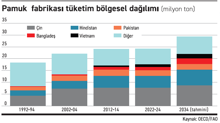 Asya, pamuk işleme ve tekstil üretiminin ana merkezi olmayı sürdürecek. Vietnam ve Bangladeş’te rekabetçi işgücü ve devlet destekleriyle kapasite genişlemesi devam ederken, Çin’in pamuk işleme payı kademeli olarak gerilemesine karşın ülke 2034’te hâlâ dünyanın en büyük pamuk işleyicisi konumunda. Ancak Çin’in zayıf ekonomik görünümü ve iç talepteki yavaşlama, kısa vadede tüketim artışını sınırlıyor.