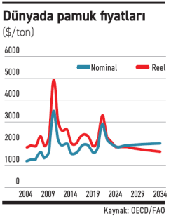 Ham pamuk ticareti yılda yüzde 1.6 büyüyerek 2034’te 12.3 milyon tona çıkacak. Çin, yaklaşık 2.9 milyon tonla en büyük ithalatçı konumunu korurken büyümenin lokomotifi Vietnam ve Bangladeş olacak. ABD ve Brezilya, gücünü sürdürecek. Sahra Altı Afrika ülkeleri de 2034’te küresel ihracatın yüzde 14’ünü karşılayacak; ancak Etiyopya ve Benin’de büyüyen tekstil endüstrisi bölgenin uzun vadeli net ihracatçı pozisyonunu zayıflatabilir.