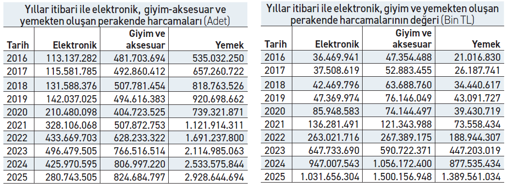 2025’te en dikkat çekici kalem ise yemek harcamaları oldu. 2024’te 878 milyar TL olan yemek harcamaları, 2025’te 1,39 trilyon TL’ye yükseldi. Enflasyondan arındırıldığında 2025’te yemek harcamaları yaklaşık 1,06 trilyon TL seviyesine ulaştı. Bu da yüzde 21’lik bir reel artış anlamına geliyor. Zorunlu tüketim kalemi olan yeme-içme, harcama artışını enflasyonun belirgin biçimde üzerine taşımış durumda. Adet verilerinin en güçlü olduğu kalem de açık ara yemek harcamaları oldu. 2024’te 2,53 milyar olan kartlı yemek harcaması adedi, 2025’te 2,93 milyara yükseldi. Bu artış, yaklaşık yüzde 15,6’lık bir büyümeye karşılık geliyor. Yemek harcamaları, hem ciroda hem de adette artış gösteren tek ana kalem olarak öne çıkarken, zorunlu tüketim niteliği sayesinde yeme-içme sektörü ekonomik yavaşlamaya karşı en dayanıklı alanlardan biri haline geldi.