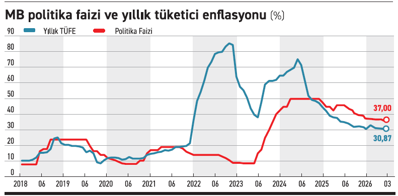 Orta Doğu’yu karıştıran savaşta sona doğru gelindiğine yönelik açıklamalar gelse de kafa karışıklığı, belirsizlikler ve savaşın maliyetinin yayılma etkisi öne çıkmaya devam ediyor. Savaş boyunca yabancının sert çıkışına karşı TL’yi korumak için rezervlerini kullanan Merkez Bankası’nın beklentinin altında gelen mart ayı enflasyona rağmen 22 Nisan’daki Para Politikası Kurulu toplantısında harekete geçmesi bekleniyor. Hafta sonu elektrik ve doğalgaz fiyatlarına yapılan zamların da etkisiyle nisanda yüzde 3 seviyesinde beklenen aylık enflasyon tahminlerinin yanı sıra Merkez Bankası’nın güçlü bir mesaj vermesi ve TL’yi korumaya devam etmesi için yüzde 37 olan politika faizini yüzde 40’a çekmesi beklentileri arttı. Ekonomistlerin yılsonu enflasyon ve politika faizi tahminlerinde de yukarı yönlü güncellemeler devam ediyor.
