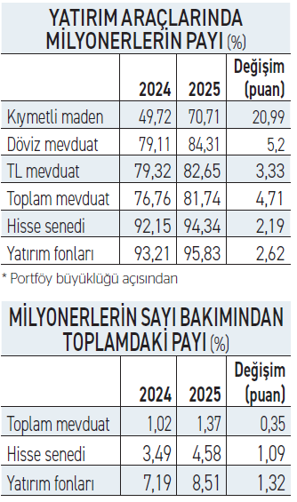 Kıymetli maden mevduatı tüm yatırım araçları arasında milyonerlerin payının son bir yılda en çok arttığı tür oldu. Ki bunda altın fiyatlarının son bir yılda iki kat artış göstermesinin etkisi büyük. 2024 yılında kıymetli maden mevduatında 1 milyon üzeri portföyü olanların toplam içindeki payı sadece yüzde 49,72 iken 2025 yılında yüzde 70,71’e fırladı, böylece 21 puana dayanan bir artış gerçekleşti. Kıymetli maden mevduatından aldıkları paya göre milyonerler ile diğerleri arasındaki makas da milyonerler lehine açıldı. 2024 yılında 1 milyon altı kıymetli maden mevduatı olanlar ile neredeyse milyonerlerin payı eşit iken 2025 yılında makas 2.4 kata çıktı.