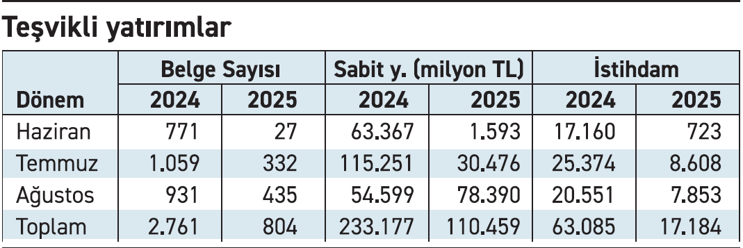 2024 yılı Haziran-Ağustos döneminde 233 milyar 177 milyon liralık sabit yatırım öngören 2 bin 761 proje için teşvik belgesi düzenlenmişti. Bu yılın aynı döneminde düzenlenen teşvik belgesi sayısı yüzde 61.17 azalarak 804’e geriledi. Öngörülen sabit yatırım tutarı yüzde 52.6 azalarak 110 milyar 727 milyon dolara indi.