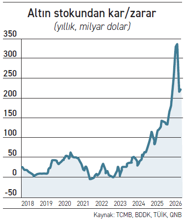 Fiyat değişimlerinin etkisini ise QNB ekonomistleri şöyle hesaplıyor: “Ay sonu ton cinsinden stok miktarının bir önceki ay sonu değeriyle ortalaması alınarak aylık ortalama stok tutarı belirlenmiştir. Bu tutar da aylık altın fiyat değişimiyle çarpılarak aylık değer değişim etkisi hesaplanmıştır. Mart ayı altın ithalat ve ihracat verileri, Ticaret Bakanlığı'nın öncü dış ticaret verilerinden alınmıştır. Aydan aya büyük dalgalanma göstermeyen yurt içi üretim verisi en son şubat için açıklanmıştır; bu nedenle mart değeri son 3 ayın ortalaması olarak varsayılmıştır. Resmi veriler açıklandığında tahminler revize edilecektir.”