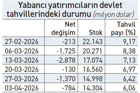 Sert satış yabancının devlet tahvilleri stoku içindeki payını da geriletti. 27 Şubat haftasında Merkez Bankası verilerine göre yüzde 9,17 olan yabancı payı 6 Mart haftasında yüzde 8,38’e, 13 Mart haftasında yüzde 7,13’e, 20 Mart haftasında yüzde 6,97’ye, 27 Mart haftasında yüzde 6,42’ye, 3 Nisan haftasında ise yüzde 6,06’ya kadar geriledi. Böylece devlet tahvillerinde yabancı payı Haziran 2025’teki seviyesinde geri dönmüş oldu.