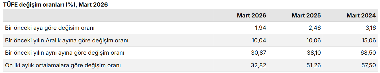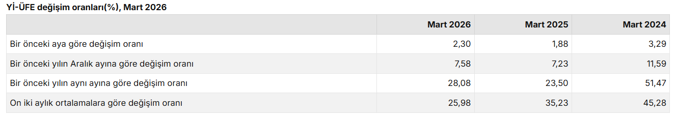 Yurt İçi Üretici Fiyat Endeksi (Yİ-ÜFE) mart ayında bir önceki aya göre yüzde 2,30, bir önceki yılın aralık ayına göre yüzde 7,58, bir önceki yılın aynı ayına göre yüzde 28,08 ve on iki aylık ortalamalara göre yüzde 25,98 artış gösterdi.