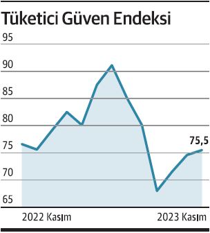 Tüketici güven endeksi kasımda aylık bazda yüzde 1,1 artarak 75,5’e yükseldi. Gelecek 12 aylık dönemde hanenin maddi durum beklentisi ise yüzde 2,6 arttı.