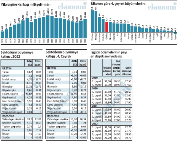2022’nin son çeyreğinde Türkiye yüzde 3,5’lik büyüme performansı ile son çeyreğinde yüzde 7,2 büyüyen Filipinler, yüzde 7 büyüyen Malezya, yüzde 5 büyüyen Endonezya ve yüzde 4,4 büyüyen Hindistan’dan sonra beşinci sırada yer aldı. Yıllık yüzde 5,6’lık büyüme ile de Türkiye yapılan hesaplamalara göre dünyada en hızlı büyüyen ilk 10 ekonomisi arasında bulunuyor. Diğer ülkelere göre daha iyi büyüme performansı gösterse de işgücü ödemelerinin milli gelirde payının son 4 çeyrektir sürekli azalması ve 2022 yılında da 3,6 puan gerilemesi büyümenin kapsayıcılığı tartışmalarını artırdı. Emeğin milli gelirden aldığı pay 2022 son çeyreğinde yüzde 25,2 ile tarihi en düşük seviyelerine gerilerken net işletme artığı/karma gelirin payı yani sermaye payı yüzde 56,7'ye çıktı. 2022 yılında da işgücü ödemelerinin payı yüzde 30,1’den yüzde 26,5’e düştü, net işletme artığı/ karma gelirin payı yüzde 52,5'ten yüzde 54,5'e yükseldi.