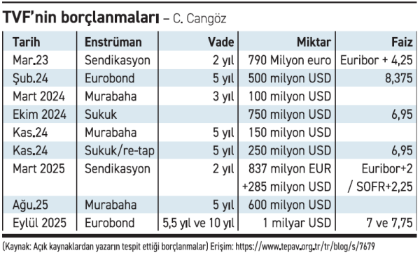 Bu çerçeveyi esneterek bilanço dışı bir alternatif borçlanma kanalının oluşması kamu maliyesi açısından da yeni ve dikkatle izlenmesi gereken bir risk kaynağı yaratıyor. Bu bağlamda, TVF’nin kuruluş amacına uygun olarak varlık fonu fonksiyonuna odaklanması ve görünürlüğü sınırlı bir borçlanma kurumuna evrilmekten kaçınması gerekiyor” uyarısında bulundu.