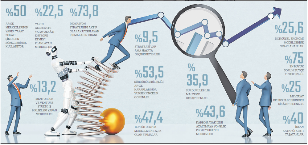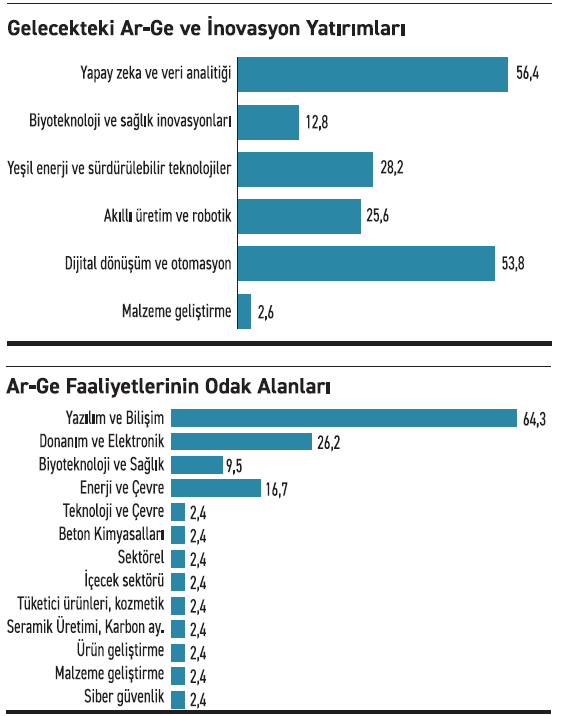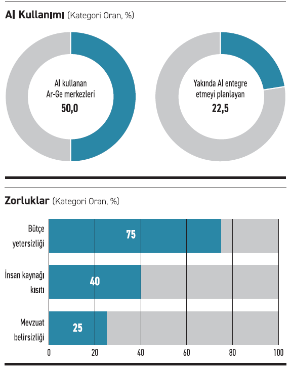 Dijital dönüşümün Ar-Ge üzerinde yarattığı etkiler raporda güçlü biçimde hissediliyor. Ankete katılan firmaların yüzde 50’si Ar-Ge süreçlerinde halihazırda yapay zekâ uygulamalarını kullanıyor; yüzde 22,5’i yakın gelecekte bu teknolojileri entegre etmeyi planlıyor. Yine büyük çoğunluk, kurumsal inovasyon stratejisine sahip olduklarını ifade ediyor: yüzde 73,8’lik kesim bir stratejilerinin olduğunu ve aktif olarak uyguladıklarını, yüzde 9,5’lik bir grup ise stratejileri olduğu halde hayata geçiremediklerini belirtiyor.