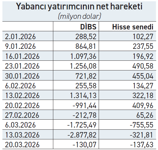 Yabancı yatırımcı ABD ve İsrail’in İran’a yönelik saldırısının başlamasıyla birlikte TL varlıklarda sert satışa başladı. 28 Şubat’ta başlayan saldırılarla birlikte martın ilk günlerinden itibaren TL devlet tahvilleri ve hisse senetlerine yılın ilk iki ayında giriş yapan yabancının çıkışı hızlandı. Merkez Bankası verilerine göre martın ilk üç haftasında yabancı yatırımcı devlet tahvillerinde 4 milyar 733,4 milyon dolar, hisse senedinde ise 1 milyar 215 milyon dolar net satış gerçekleştirdi. Devlet tahvillerinde en yoğun satış savaşın ilk iki haftasında yaşanırken geride kalan 19 Mart ile tamamlanan kısa bayram haftası itibariyle yabancının devlet tahvilleri ve hisse senetlerinde net çıkışı 5 milyar 948,4 milyon dolara ulaştı.